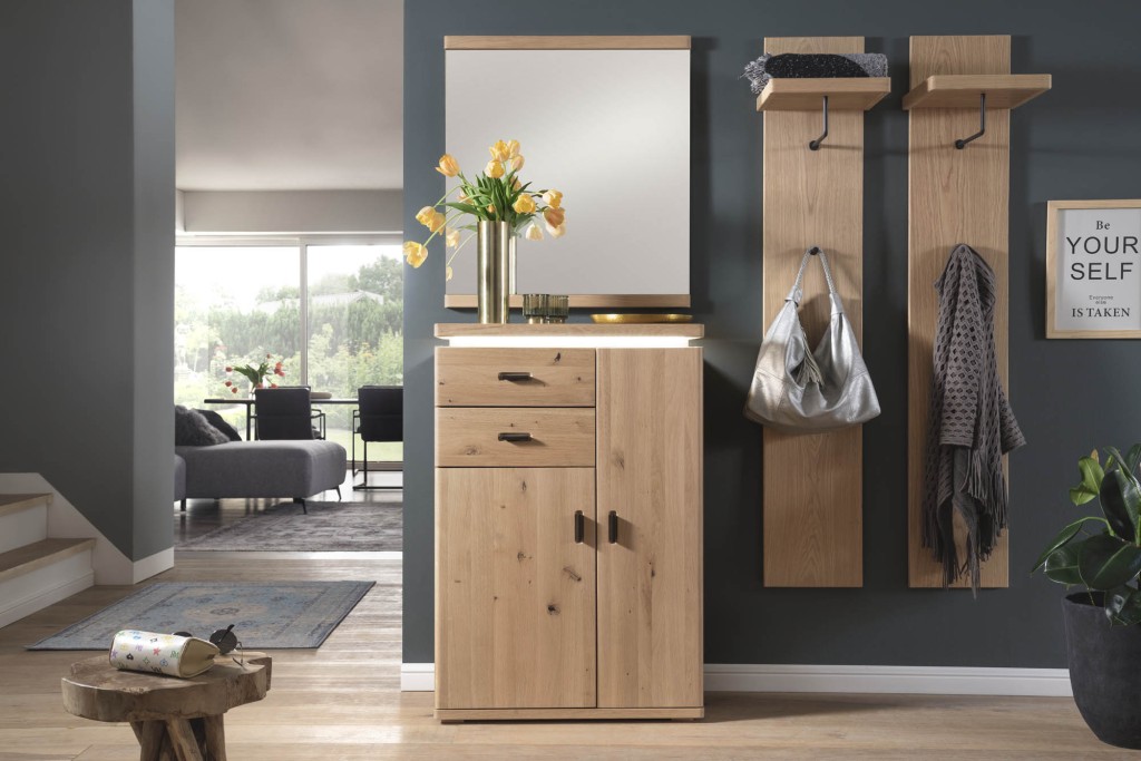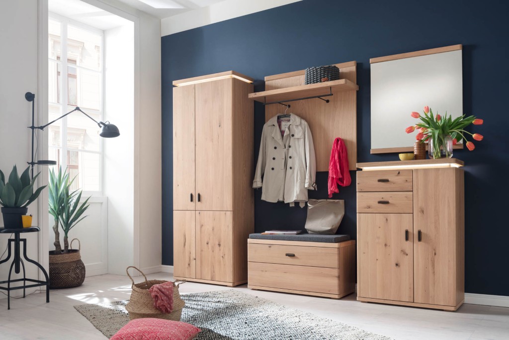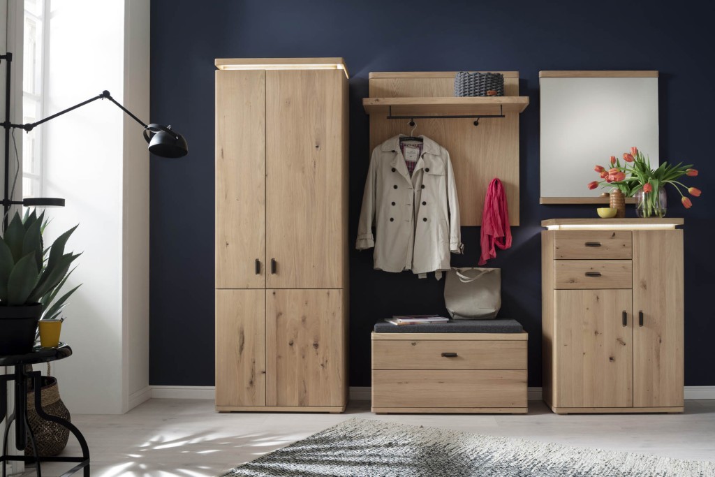 Balkeneiche Bianco, Front Balkeneiche Bianco massiv durchgehende Lamelle, geölt, Korpus Eiche Bianco furniert, Oberfläche geölt, Rückwand hinter Türen & Schubkästen Balkeneiche Nachbildung, Griff Metall schwarzgrau, Schubkästen Unterflurführung gedämpft, Türen gedämpft, bestehend aus: T83 - Garderobenschrank, 2-Türen, Kleiderstange ausziehbar, 3-Böden, BHT ca. 75/204/38 cm T80 - Bank, 1-Klappe, 2-Böden, BHT ca. 90/47/38 cm T90 - Garderobenpaneel, 1-Paneel, Hutablage, Kleiderstange, 3-Haken, BHT ca. 98/93/30 cm T86 - Kommode, 2-Türen, 2-Schubkästen, 7-Böden, BHT ca. 75/111/38 cm T93 - Spiegel, BHT ca. 75/82/3 cm Gesamtmaß ca. BHT ca. 260/204/38 cm